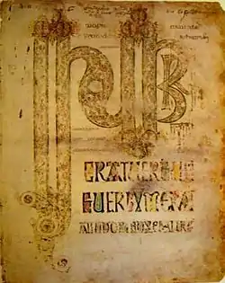 The Durham Gospels is a very incomplete late 7th-century insular Gospel Book, now kept in the Durham Cathedral Dean and Chapter Library (MS A.II.17). A single folio of this manuscript is now in Magdalene College, Cambridge (Pepysian MS 2981). Only two of the fully decorated pages survive: a Crucifixion (the oldest in English art) and the initial to John, and both of these are in poor condition. There were probably originally evangelist portraits and carpet pages, as in other Insular Gospel books conceived on a similar scale. The book was produced at Lindisfarne and brought to Durham when the monks of Lindisfarne removed to Durham because of Viking attacks. The Durham Gospels were written by the same scribe who wrote the Echternach Gospels, now in Paris.