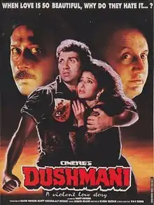 Dushmani (lit.'Enmity') is a 1995 Indian Hindi-language romantic action film directed by Bunty Soorma. It stars Sunny Deol, Jackie Shroff, Manisha Koirala, Deepti Naval, Anupam Kher in pivotal roles.[2][3] The rights of this film are now owned by Shah Rukh Khan's Red Chillies Entertainment.[4] Acclaimed director Shekhar Kapur directed major portions of the film.[5]
