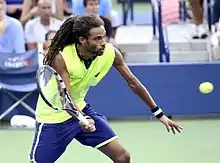 Dustin Brown (born 8 December 1984)[1] is a German-Jamaican professional tennis player. He rose to fame after beating Rafael Nadal in the 2014 Halle Open and Wimbledon 2015, and is known for his technique, speed, and entertaining playing style, often entertaining the crowd with trick shots. He is also known as "Dreddy" due to his distinctive long dreadlocked hair.