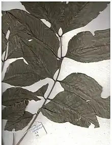These are tall canopy trees with a straight bole, growing to a height of about 35 m. The bark, about 5–8 mm thick, is greyish brown and covered densely with large, corky lenticels. The bark exfoliates in large rectangular scales. When the bark is cut, the blaze appears yellow and white.[4][5] The young branchlets are angular and minutely hairy. The compound leaves are paripinnate (ending in a pair of leaflets), up to 30 cm (occasionally 40 cm) long, arranged alternate, spiral, and clustered at twig ends. The petiole is pulvinate (swollen at base). The rachis is angular, 17–20 cm long. The leaves have 4-6 pairs of leaflets with petiolules about 0.5-0.9 cm long. The leaflets are alternate or subopposite, about 9–22 cm in length by 4–7 cm wide. Leaflets are coriaceous, elliptic-lanceolate in shape and have an acuminate apex, asymmetric base, and an entire margin. The midrib is raised above the dorsal surface of the leaf. Leaflets have 12-20 pairs of prominent secondary nerves, with hairy domatia in the axils of the secondary nerves. Tertiary nerves are obscurely visible and reticulo-percurrent. Prominent inter-secondary veins are seen between secondary nerves.