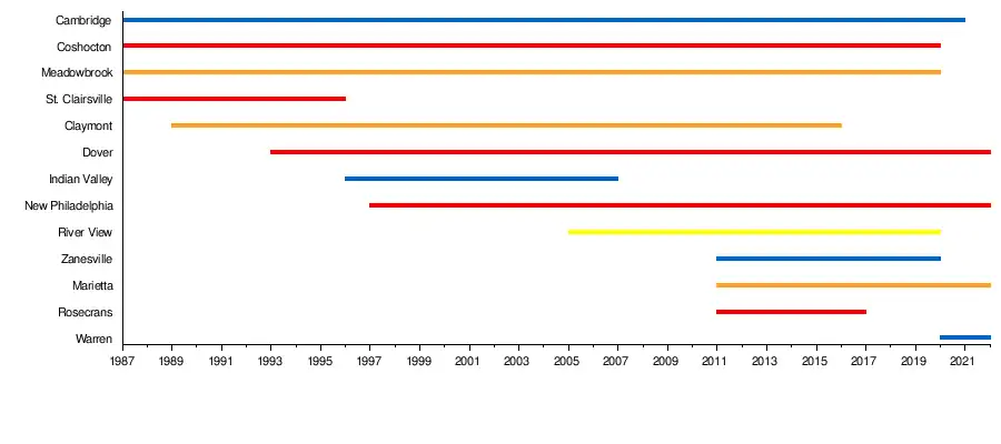 Cambridge left in 2021 for the Buckeye 8,[8] and New Philadelphia announced they would be leaving to join the Ohio Cardinal Conference starting in 2022.