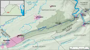 The East River is a tributary of the New River, 24 miles (39 km) long,[3] in southern West Virginia and southwestern Virginia in the United States. Via the New, Kanawha and Ohio rivers, it is part of the watershed of the Mississippi River, draining an area of 76.4 square miles (198 km2)[4] in the Ridge-and-Valley Appalachians.
