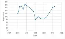 In 1880, the population density of Easton was 0.125 people per hectare, dropping to 0.0625 people per hectare in 1900 where it remained fairly constant until 1960.[12] However, by 2001, the population density had increased to 0.3 people per hectare[13] and remained the same until 2011.[14]