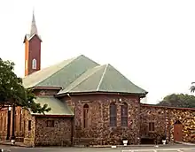 The Ebenezer Presbyterian Church, formerly known as the Basel Mission Church, Christiansborg, is a historic Protestant church located in the suburb of Osu in Accra, Ghana. The church was founded by the Basel Evangelical Missionary Society in 1847.[1] Previously near the Christiansborg Castle at a hamlet called Osu Amanfong, where a commemorative monument now stands, the church relocated northwards to its present location near the Salem School when a new chapel was constructed and consecrated in 1902.[1][2][3] The church is affiliated to the Presbyterian Church of Ghana.[1] Liturgical services are conducted in English and the Ga language.[1]