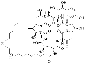 (9Z,12Z)-N-{(2R,6S,9R,11R,12R,14aS,16R,20S,23S,25aS)-23-[(1S,2S)-1,2-Dihydroxy-2-(4-hydroxyphenyl)ethyl]-2,11,12-trihydroxy-6,20-bis[(1R)-1-hydroxyethyl]-16-methyl-5,8,14,19,22,25-hexaoxotetracosahydro-1H-dipyrrolo[2,1-c:2',1'-l] [1,4,7,10,13,16]hexaazacyclohenicosin-9-yl}-9,12-octadecadienamide | |