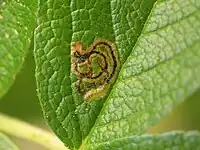 The larvae feed on Filipendula vulgaris, Rosa canina, Rosa pendulina, Rosa sempervirens, Sanguisorba minor and Sanguisorba officinalis. They mine the leaves of their host plant. The mine consists of a strongly contorted, intestine-like corridor with brown and coiled frass. The last part of the corridor often follows the leaf margin for some distance. At the end, the corridor widens into an elongate blotch. Pupation takes place outside of the mine.