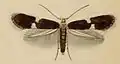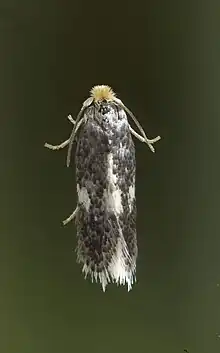 The wingspan is 7 mm. The head is ochreous-yellow with a whitish collar. The antennal eyecaps are also whitish. Forewings dark fuscous ; a small costal spot before middle, and a larger dorsal spot before the tornus whitish ; outer half of cilia whitish. Hindwings grey.[1]