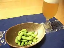 Edamame (枝豆, /ˌɛdəˈmɑːmeɪ/) is a Japanese dish prepared with immature soybeans in the pod. The pods are boiled or steamed and may be served with salt or other condiments. The dish has become popular across the world because it is rich in vitamins, dietary fiber, and isoflavones.[1] When the beans are outside the pod, the term mukimame is also sometimes used in Japanese.[2] Edamame are a common side dish in Japanese cuisine and as an appetizer to alcoholic beverages such as beer or shōchū. As an ingredient Edamame are found in both sweet and savory dishes such as takikomi gohan, tempura, and zunda-mochi.