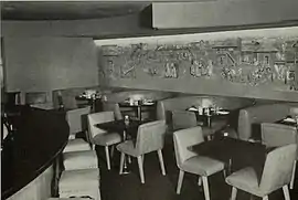 Around that time, Edgar mostly focused on ecclesiastical work, creating many new stained-glass windows for churches, temples[5] and hospitals. In 1950, he was hired by the Container Corporation of America to design a poster for its Great Ideas of Western Man series. Then a series of new commissions: murals depicting Chicago history for the Chicago Title and Trust Company, barbecue scenes for a Fred Harvey restaurant, foyer and bar murals for the Palmer House hotel, a company history of the Hudson Pulp and Paper Corporation, and several sculptural projects for Jo Mead Designs. Notably, in 1954 he was commissioned by the Standard Club to design two sets of glass doors and four murals. The murals were carved onto large black linoleum panels. In 1959, Miller was hired to produce murals for the Marco Polo Club in the Waldorf-Astoria in New York City. Back in Chicago, he designed sculptures for the new United States Gypsum Building. The second Love Through the Ages mural was painted at the Tavern Club in 1961; the first one was taken down and cut up into about eighty paintings which were sold to raise money for the club.[1][6][7][8]