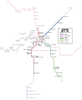 The ETS started operation of the original LRT line in 1978, expanded by 2010 into the Capital Line, running between Clareview in Edmonton's northeast and Century Park in Edmonton's south end.[3] The first phase of the newer Metro Line started service between the University of Alberta campus and hospital in Edmonton's southcentral and the Northern Alberta Institute of Technology northwest of downtown Edmonton in 2015, with further expansion to north Edmonton and neighbouring city of St. Albert planned into the future.[4] Construction of the first phase of the 27-kilometre (17 mi) Valley Line, from downtown Edmonton to Mill Woods in southeast Edmonton, began in spring 2016, and opened November 4, 2023. Construction on the second phase of the Valley Line, connecting downtown to west Edmonton, began in fall 2021 and is scheduled for completion by 2028.[6][7][8]