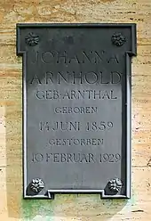 Arnhold died in 1925 at the age of 76 in Neuhaus am Schliersee. His grave is located at the Friedhof Wannsee, Lindenstraße in Wannsee. He rests there at the side of his wife Johanna Arnhold née Arnthal (1859-1929).[9] In front of the grave wall with inscription plaques is a sculpture by Theodor Georgii depicting a farewell scene.[10] By decision of the Senate of Berlin, the final resting place of Eduard Arnhold (grave location Li AT FW-38) has been dedicated as an honorary grave of the State of Berlin since 1992. The dedication was extended in 2018 for the usual period of twenty years.[11]