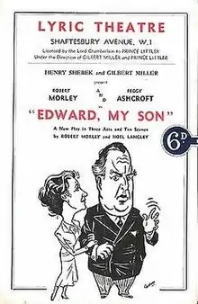 Edward, My Son is a British play written by Noel Langley and Robert Morley. Its original West End run lasted for 782 performance between 30 May 1947 and 23 April 1949, initially at His Majesty's Theatre and then at the Lyric Theatre.[1] The play portrays the moral decline of a business tycoon, Sir Arnold Holt, who has worked his way up from humble beginnings. Holt's efforts for social advancement are driven by his desire to provide the best for his only son, Edward of the title, who never actually appears.