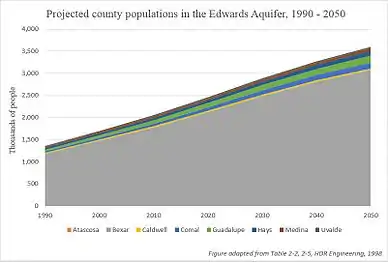 In addition to the 2.3 million San Antonio residents are the communities of New Braunfels and San Marcos that depend on the aquifer for clean drinking water. Farming and ranching communities are other significant dependents of the aquifer.[49] From the 1930s to the 1980s, withdrawals have quadrupled with over half of the current withdrawals serving municipal water purposes while the remaining goes to agricultural needs.[50][51] More than 50,000 people in the city of Austin (6% of Austin's population) rely on the Barton Springs segment of the Edwards Aquifer.[39]