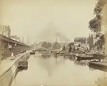 In 1877–79 the railway line from Haarlemmerpoort station was extended to the auxiliary station at the Droogbak and in 1889 to the new Central Station. Before construction of the railroad started, in 1872 the Eilandsgracht was partially filled in.[4] A rail viaduct was built half on the Houttuinen and half on the filled in side of the canal. In 1918 it was decided to double the tracks, taking another strip of the Eilandsgracht. So little remained between Bickerseiland and the mainland that in 1928 it was completely filled in.[5]