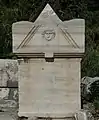 The most common type of burial in this necropolis was made up of twin-urns with the remains of the same individual - one containing the ashes and the other the bones mixed personal possessions, as well as two jugs and a bowl for drinking. About a fifth of the discovered urns with bone remains contained a scarab-amulet. The researchers, led by Professor María Eugenia Aubet from the Pompeu Fabra University in Barcelona, also excavated a few stelae which bore inscriptions and human masks sculpted from terracotta.[8] Some of them are considered to be masterpieces and on display at the National Museum of Beirut.[10] Altogether, one has to imagine a beach with such personalised gravestones sticking out of the sand, with a view on the fortified island city. Aubet concludes: