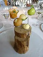 When diners first arrive, they are given a selection of small bites from a section of the kitchen called "El Món", who only produce small snack portions for the guests. They typically demonstrate flavours from around the world and come in sets of five. These introduce the diner to the unusual techniques and presentations of the restaurants. For example, a small ball of frozen spiced fish stock coated in cocoa butter represents Thailand, while the set comes on a purpose-built wooden holder.[13] While there are typical fine dining ingredients included on the menu such as lobster and foie gras, due to the Catalan influence on the menu, ingredients such as pigeon, hake and pig's trotters also appear.[14] Fish dishes include a crayfish velouté, accompanied by spring onions with cocoa and mint.[15]