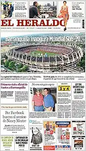 El Heraldo (English: The Herald) is a regional newspaper based in the city of Barranquilla, Colombia, founded in 1933 by Juan Fernández Ortega, Luis Eduardo Manotas Llinás, and Alberto Pumarejo Vengoechea.[1] It is the third highest circulating newspaper in Colombia mostly covering the area of the Colombian Caribbean Region and other main cities in the country.