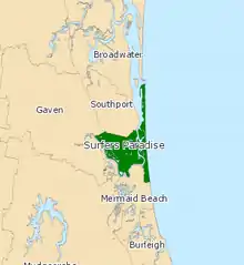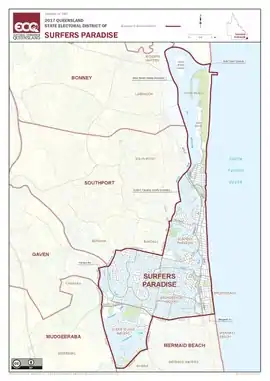 Surfers Paradise is an electoral district of the Legislative Assembly in the Australian state of Queensland. Located in the central portion of the Gold Coast, it is named for Surfers Paradise, the largest suburb of the Gold Coast.[1]