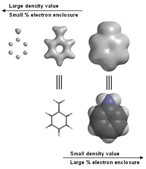 Most molecular modeling software packages allow the user to choose a value for the electron density, often called the isovalue. Some software[3] also allows for specification of the electron density in terms of percentage of total electrons enclosed. Depending on the isovalue (typical units are electrons per cubic bohr), or the percentage of total electrons enclosed, the electron density surface can be used to locate atoms, emphasize electron densities associated with chemical bonds , or to indicate overall molecular size and shape.[4]