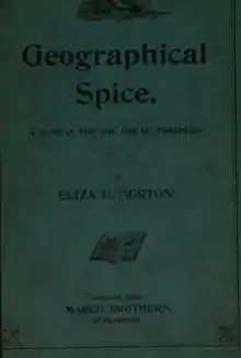 After three years at Battle Creek College, Morton withdrew and began to gather material for her geographies. Hundreds of books were examined, leading schools were visited and prominent educators in America and Europe were interviewed as to the best methods of teaching the science. In 1888, her "Elementary Geography" was completed. It was published in Philadelphia as Potters' New Elementary Geography, by Eliza H. Morton. It had a wide sale, and an immediate call was made for an advanced book, which was written under the pressure of poor health, but with care and research. The higher book was also successful.[3]