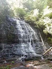 Ellicott Rock Wilderness is located in the southern tip of the Blue Ridge Mountains, a sub-mountain range of the Appalachian Mountains. It has a temperate climate with an average rainfall of 80 inches per year creating a dense forest with steep, rugged terrain. Embedded throughout the wilderness landscape are a variety of hardwood trees (creating breathtaking scenes come fall), white pines, and hemlocks with bountiful water sources including a couple waterfalls. One popular waterfall, Spoonauger Falls, is located on the Chattooga River Trail, a short quarter-mile hike from the trailhead located on Burrell's Ford road. The Wilderness is home to Glade Mountain of Georgia standing at an elevation of 3,672-foot (1,119 m) and Fork Mountain of South Carolina at an elevation of 3,294-foot (1,004 m). The watershed surrounding the Chattooga Wild and Scenic River is one of the most biologically diverse in the country. The wonderful array of sights, sounds, and smells of the wild flora and fauna bring Ellicott Rock Wilderness to life.