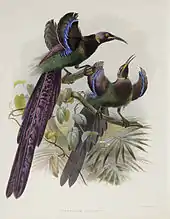 Elliot's bird of paradise is a bird in the family Paradisaeidae, first described by Edward Ward in 1873. The bird is presumed by some ornithologists to be an intergeneric hybrid between a black sicklebill and Arfak astrapia. This assumption was made by the German ornithologist Erwin Stresemann who had also dismissed other new species of birds of paradise as hybrids. Other ornithologists dispute this claim. Errol Fuller argues that the Astrapia is a fanciful choice made with little supporting evidence, and that Elliot's Bird of Paradise is much smaller than the two proposed parent species. The specimens show a number of characteristics not present in either parent species, adding weight to the possibility of the specimens constituting a unique species.[1] Stresemann had previously used the A. nigra x E. fastuosus explanation for the astrapian sicklebill as well.