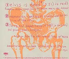 The song addresses conspiracies that iconic singer Elvis Presley had actually survived his 1977 death. "Elvis is Dead" also touches on Presley's complex relationship with African-Americans. Before, during, and after Little Richard's guest rap performance, many voices speak the song title, concluded by one announcing: "Elvis has left the building!"[2] Living Colour adapted lyrics from two previous songs. "Maybe I've a reason to believe we all will be received in Graceland" from Paul Simon's "Graceland" to yield the refrain, "I've got a reason to believe we all won't be received at Graceland." They also quote Public Enemy's "Fight the Power" in stating, "Elvis was a hero to most," but again twisted the line "But he never meant s--t to me" to "But that's beside the point."