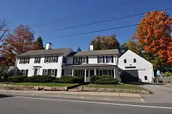 The Emery Homestead is set on the north side of Lebanon Street (United States Route 202), just west of its junction with Main Street (Maine State Route 109) in the center of Sanford. It is a rambling connected New England farmstead, with its main house joined to a barn via a series of ells. The original homestead, located at the left end of the complex is a 2+1⁄2-story wood-frame structure, five bays wide, with a side-gable roof and central chimney. The main entrance is flanked by Doric pilasters and topped by an entablature. To its right, offset to the rear, is a two-story ell, also five bays wide and with a side-gable roof; its first floor has a hip-roofed porch. A second ell extends to the rear of this one, connecting the house to the large barn.[2]