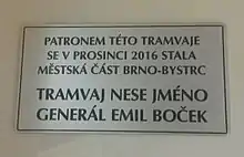 - ↑ "Nové tramvaje v Brně. Po městě jezdí Menšík, Gollová i generál Boček" (in Czech). iDNES.cz. 22 December 2016. Retrieved 18 April 2017.