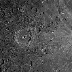 The impact ejecta and chains of secondary craters extend as far as one radius from the rim. There are no bright or dark crater rays, with the crater rim itself being higher in altitude than the surrounding cratered plains. The crater walls are degraded by slumping, forming distinct blocks of material. The crater floor consists of complex structures, including ejecta deposits, impact melts and possibly units placed by effusive volcanism.[3]