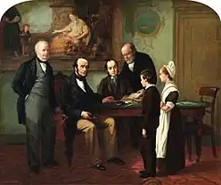 Brownlow created four paintings in the same format depicting scenes from Foundling Hospital life and are permanently displayed at The Foundling Museum. The first oil painting, dated from 1858, is titled The Foundling Returned to its Mother and is the most prominent painting of the four, depicting a mother of a foundling receiving her child back into custody. Her next painting was done in 1863, The Christening, followed by The Sick Room (1864), an oil on canvas painting depicting a romanticized version of a child being cared for in the Foundling Hospital. The fourth painting is titled Taking Leave (1868) and shows the process of a foundling preparing to begin work. The paintings are noted not only for their representation of the Foundling Hospital, but for their inclusion of reproductions of famous paintings in the Hospital's collection; including two major works by William Hogarth and one by Benjamin West. Catherine Roach notes that Brownlow's reproductions of Old Master paintings "stage a drama of redemption" for Foundling children using submerged representations of glorious causes.[4] Rachel Bowlby argues that these paintings "carried on her father's work, promoting the virtues and values of the institution through pictures of its daily life and rituals."[5] Brownlow also painted smaller works depicting foundling children as well as portraits.