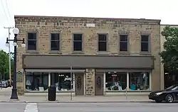 The Emporium is a three-story vernacular Greek Revival commercial building constructed of sandstone blocks. It measures forty-five feet wide by fifty-six feet deep, and has a flat roof slanting slightly downward from front to back. The front facade is symmetrical, spanning six bays wide. The first floor contains two storefronts, whose display windows have been updated from the original construction. The second story has square-head windows trimmed with sawn sandstone lintels and sills. The low attic story contains sunken panels located between the window bays. [2]