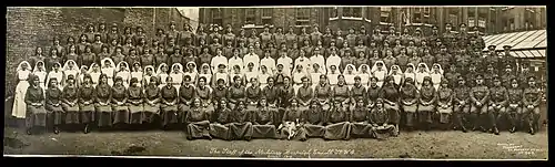 Of the twenty-six thousand patients who passed through the wards of Endell Street Military Hospital, the largest number were British with a fair proportion of Dominion and Colonial troops. There were also two thousand two hundred and seven Canadians. There were more than two thousand Australian and New Zealand patients, including those wounded in the Gallipoli campaign that began arriving in August 1915. Only two hundred U.S. troops were patients. A small number of Russian, Greek Japananes, and French wounded were patients at the hospital.[7] A small ward for service women was opened, late in the hospital's life.[8] Some satellite hospitals were also established including Dollis Hill House Auxiliary Hospital which opened in 1916.[9]