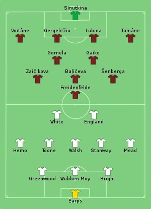Understrength Latvia arrived without several experienced regulars including Miksone, Ročāne, Fedotova and Vaivode; all unavailable for various reasons.[10] It was reported that the scheduling of the match, 21:00 Eastern European Time on a Tuesday evening, made it difficult for the Latvian players who had jobs outside football to get time off work.[11] While team captain and five-time Latvian Footballer of the Year Ševcova, a mother, was ruled out due to "family circumstances".[12]