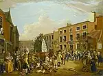 The Jack in the Green developed out of a tradition that was first recorded in the seventeenth century, which involved milkmaids decorating themselves for May Day.[44] In his diary, Samuel Pepys recorded observing a London May Day parade in 1667 in which milk-maids had "garlands upon their pails" and were dancing behind a fiddler.[44] A 1698 account described milk-maids carrying not a decorated milk-pail, but a silver plate on which they had formed a pyramid-shape of objects, decorated with ribbons and flowers, and carried atop their head. The milk-maids were accompanied by musicians playing either fiddle or bag-pipe, and went door to door, dancing for the residents, who gave them payment of some form.[45] In 1719, an account in The Tatler described a milk-maid "dancing before my door with the plate of half her customers on her head", while a 1712 account in The Spectator referred to "the ruddy Milk-Maid exerting herself in a most sprightly style under a Pyramid of Silver Tankards".[46] These and other sources indicate that this tradition was well-established by the eighteenth century.[47]