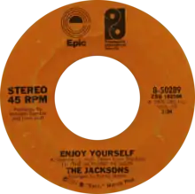 "Enjoy Yourself" is a song recorded by the Jacksons and released as a single in 1976. Featuring Michael and Jackie Jackson on lead vocals, it was the first single for the group since they departed from Motown earlier that year. The song peaked at number 6 on the US Billboard Hot 100 songs chart on February 19, 1977.[1] On other US charts, "Enjoy Yourself" peaked at number 2 on the Hot Soul Singles chart[2] and number 33 on the National Disco Action Top 40 chart.[3] On February 14, 1989, it became the group's first single to be certified Platinum by the Recording Industry Association of America (RIAA) in the United States.[4] It was also the group's first song to feature new member Randy Jackson, who replaced Jermaine Jackson when he decided to stay at Motown after his brothers left.