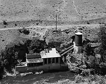 The Enloe Dam, also known as the Similkameen Dam, and its powerplant are located on the Similkameen River about 4 miles (6.4 km) west-northwest of Oroville, Washington. Located just above Similkameen (Coyote) Falls, the concrete arch-gravity dam stands about 54 feet (16 m) high, with a crest length of about 290 feet (88 m), built between 1916 and 1923. The dam was named after the president of the Okanogan Valley Power Company, Eugene Enloe. The dam was operated to generate power at its powerplant, located about 850 feet (260 m) downstream from the dam.[2] Lacking fish ladders, Enloe Dam blocks fish passage and completely extirpated anadromous fish migration into the upper reaches of the Similkameen River and its tributaries in Canada.[3]