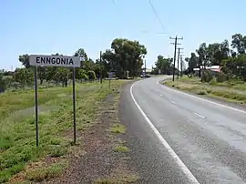 Enngonia, formerly known as Eringonia, is a small town in the north-west of New South Wales, Australia, in Bourke Shire, approximately 98 kilometres (61 mi) north of the regional centre of Bourke. The Warrego River runs just to the west of the town. The central street, Belalie Street, is otherwise the Mitchell Highway running north-south.