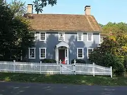 The Ephraim Wheeler House stands in what is now a suburban residential area of Stratford's Putney neighborhood, on the north side of Whippoorwill Lane at its junction with Rosebrook Drive. It is a 2+1⁄2-story wood-frame structure, five bays wide, with twin chimneys, shingled exterior, and a side-gable roof. Small additions added in the 19th and 20th centuries expand the building to three sides. The main entrance is flanked by sidelight windows and sheltered by a small gable-roofed portico with round columns. The interior follows a central hall plan, and retains original features, particularly the fine Georgian woodwork of the main hall and stair.[2]