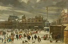 His main specialty was the composition of animated townscapes, in particular of city squares. His composition The Ommegang in Antwerp is an example of such a work. It was reinterpreted by various Flemish artists including Alexander van Bredael.[10] It may itself have been inspired by Pieter van Aelst's painting with the same theme.[11] Another lively city scene of Antwerp is the Figures in front of the frozen Scheldt in Antwerp painted in 1670 (Artcurial sale of 13 November 2018 lot 43). It shows a winter landscape of the river Scheldt, seen from the Anwerp quays. The Scheld is frozen solid and several tents and pavilions selling all kinds of food have been constructed on the ice. Several inhabitants of Antwerp are seen playing on the icy river, enjoying banquets and engaging in other amusements during the winter of 1670. The artist depicts various amusing scenes such as a woman on the verge of falling out of a sleigh pulled by a horse, a man defecating on the ice who is being chased way and a couple of men engaged in a brawl. Fellow Antwerp artist Sebastiaen Vrancx (1573-1647) painted half a century earlier the Ice pleasure on the Scheldt in Antwerp (Rijksmuseum, Amsterdam) showing a similar view of Antwerp's citizens having fun on the Scheldt.[12]
