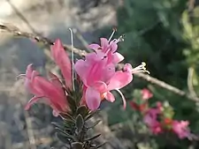 The flowers are borne singly in leaf axils on a stalk 2–3 mm (0.08–0.1 in) long. There are 5 triangular, green sepals which are 2–4 mm (0.08–0.2 in) long. The petals are 20–25 mm (0.8–1 in) long and joined at their lower end to form a tube. The flower buds are orange-coloured but when open, the tube is bright pink to red or purplish. The petal lobes are pointed and the lowest lobe is curved backwards. The 4 stamens extend beyond the petal tube. Flowering mostly occurs from August to May but the flowers are usually most prolific from October to December. Flowering is followed by fruit which are dry, oval-shaped and 6.5–7.5 mm (0.3–0.3 in) long.[2][3][4][5][6]