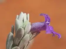 Eremophila hygrophana, also known as the blue emu bush,[2] is a flowering plant in the figwort family, Scrophulariaceae and is endemic to Australia. It is an erect, compact shrub with crowded, grey leaves and violet to purple flowers and is found in South Australia and Western Australia.