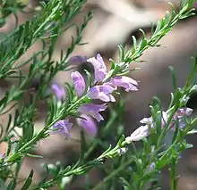 The flowers are borne singly in leaf axils on a hairy stalk 3–6 mm (0.1–0.2 in) long and are usually clustered near the ends of the branches. There are 5 green, egg-shaped, tapering sepals which are mostly 7.5–10.5 mm (0.3–0.4 in) long, glabrous on the outer surface but hairy on the inside. The petals are 20–30 mm (0.8–1 in) long and are joined at their lower end to form a tube. The petal tube is sometimes pink to red with pink spots on a light colour inside the tube, or cream and without spots. The petal tube is mostly glabrous except that the inside of the tube is filled with long, soft hairs. The 4 stamens extend beyond the end of the petal tube. Flowering occurs from June to December and is followed by woody, oval-shaped to top-shaped fruits with a pointed end and which are 8–10 mm (0.3–0.4 in) long and have a thin, papery covering.[2][3]