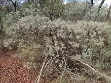 Eremophila phyllopoda is a compact, flat-topped shrub or a spreading shrub depending on subspecies, and grows to a height of between 0.4 and 2 m (1 and 7 ft). Its branches and leaves are covered with a layer of silvery to dull grey simple hairs that are sometimes stained brown. The branches are rough due to the prominent, projecting leaf bases and sticky due to the presence of resin. The leaves are arranged alternately and clustered near the ends of the branches. They are linear to elliptic in shape, taper towards both ends, 18–110 mm (0.7–4 in) long, 1.5–7 mm (0.06–0.3 in) wide, have a covering of hairs which are pressed against the leaf surface and sometimes obscured by resin.[2][3]