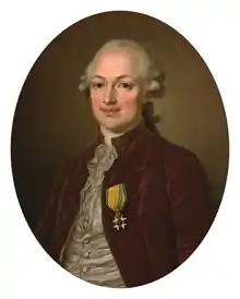 Baron Erik Magnus Staël von Holstein, (25 October 1749, Loddby, Sweden – 9 May 1802, Poligny, France) was a Swedish diplomat, soldier and courtier best known for being Sweden's Ambassador to France during the end of the Ancien Regime and the early years of the French Revolution, as well as being the husband of Madame de Staël. Erik Magnus assisted Gustav III during the Swedish Revolution of 1772 and was later named Chamberlain to Queen Sophia Magdalena. In 1783, he was appointed chargé d'affaires to the Court of France, and in 1785 he was named Ambassador. On 21 January 1786, he married the daughter of the French Minister of Finance, Jacques Necker, mademoiselle Anne Louise Germaine Necker, who was to achieve fame as "Madame de Staël".