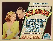 Escapade is a 1932 Pre-Code American crime film directed by Richard Thorpe and starring Jameson Thomas, Sally Blane and Anthony Bushell.[1] It is also known by the alternative title of Dangerous Ground.