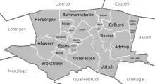 Essen consists of the following villages: Addrup, Ahausen, Barlage, Bartmannsholte, Beverdiek, Bevern, Bokel, Brokstreek, Calhorn, Darrel, Essen proper, Felde, Gut Lage, Herbergen, Hülsenmoor, Nordholte, Osteressen, Sandloh and Uptloh.