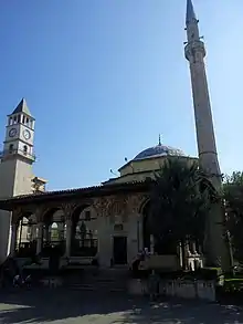 Etëhem Bey finished in 1819 or 1821 the Ethem Bey Mosque in the main square of Tirana, which bears his name. The mosque was started by his father Molla Bey between 1791 and 1794. He was buried in Ethem Bey Mosque, next to his wife Balkis.[1]
