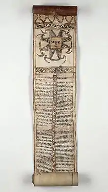 The John Rylands Library owns 45 items on parchment and paper, dating from the 1600s and later. The majority (31 items) came to the library from the Crawford collection, purchased in 1901.[21] In addition to a copy of the Fetha Nagast (Ge'ez: ፍትሐ ነገሥት) (Ethiopian MS 13) and a deed of Dawit III (Ethiopian MS 28), the collection includes a number of magic scrolls (Ethiopian MSS 29-34).