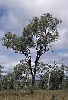 Eucalyptus quadricostata, commonly known as the square-fruited ironbark,[2] is a species of small to medium-sized ironbark that is endemic to Queensland. It has rough ironbark on the trunk and branches, lance-shaped to curved adult leaves, flower buds in groups of seven, white flowers and cup-shaped fruit that are square in cross-section.
